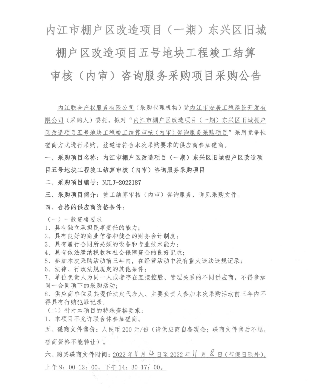 内江市棚户区改造项目(一期)东兴区旧城棚户区改造项目五号地块工程竣工结算审核(内审)咨询服务采购项目采购公告