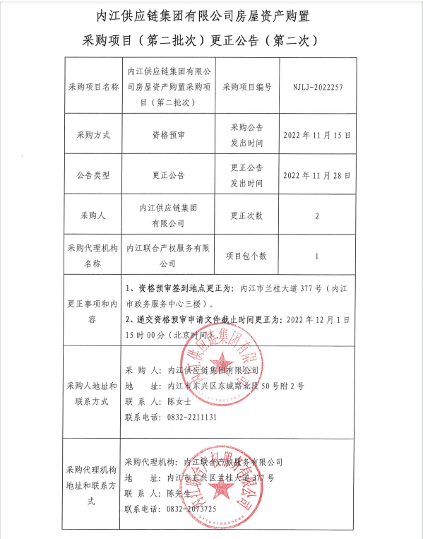 内江供应链集团有限公司房屋资产购置采购项目(第一批次)资格预审更正公告(第二次)