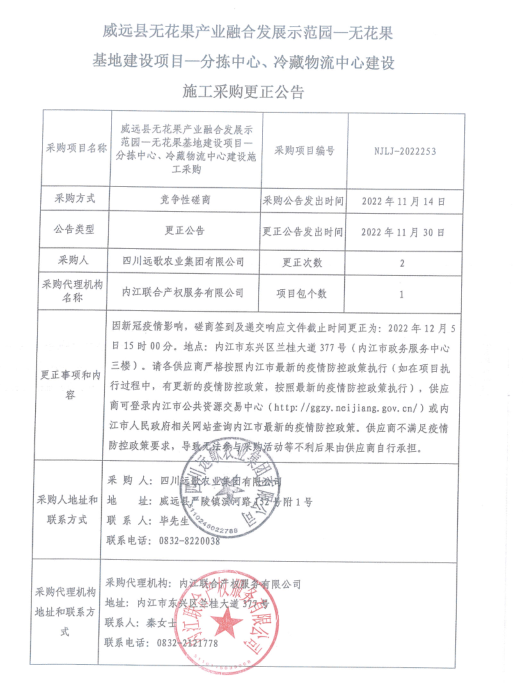 威远县无花果产业融合发展示范园—无花果基地建设项目—分拣中心、冷藏物流中心建设施工采购更正公告