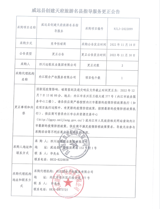 威远县创天府旅游名县旅游风景道景观设计制作安装单位采购项目更正公告