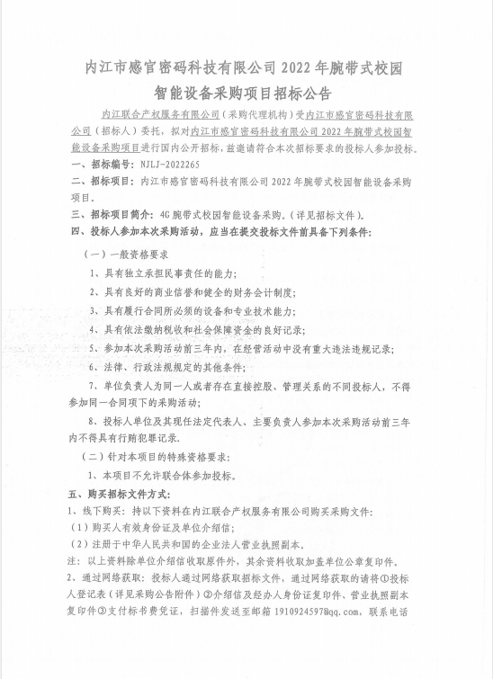 内江市感官密码科技有限公司2022年校园4G智能腕式电子学生证采购项目招标公告