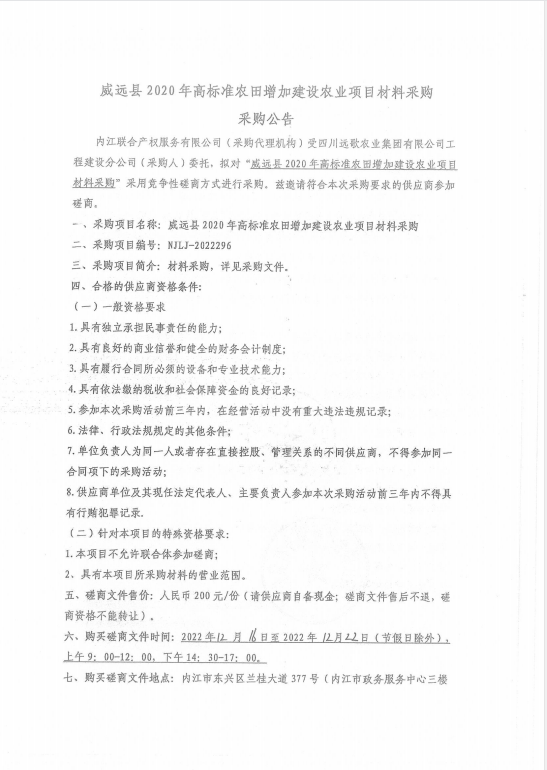 威远县2020年高标准农田增加建设农业项目材料采购采购公告