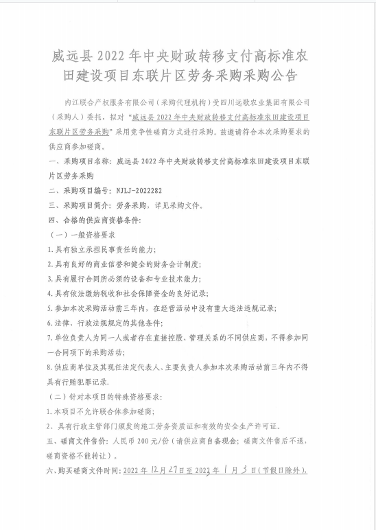 威远县2022年中央财政转移支付高标准农田建设项目东联片区劳务采购采购公告
