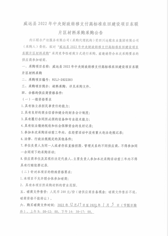 威远县2022年中央财政转移支付高标准农田建设项目东联片区材料采购采购公告