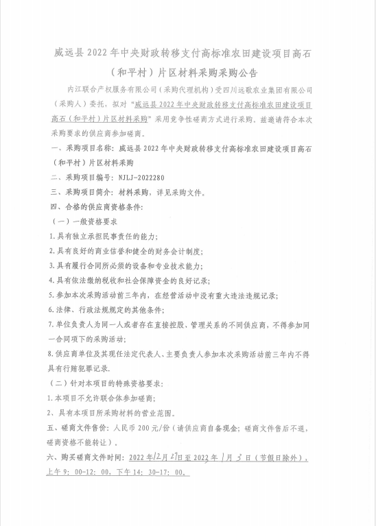 威远县2022年中央财政转移支付高标准农田建设项目高石(和平村)片区材料采购采购公告