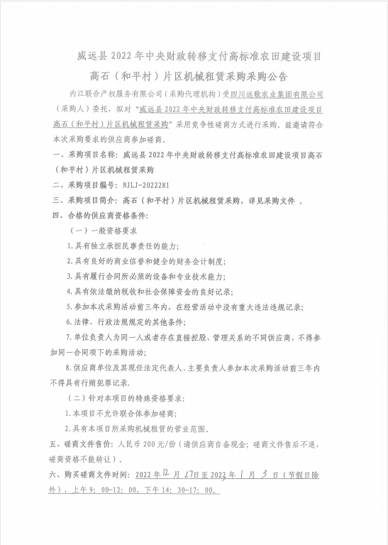 威远县2022年中央财政转移支付高标准农田建设项目高石(和平村)片区机械租赁采购采购公告