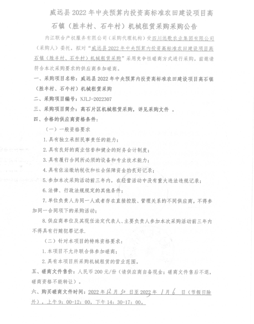 威远县2022年中央预算内投资高标准农田建设项目高石镇(胜丰村、石牛村)机械租赁采购采购公告