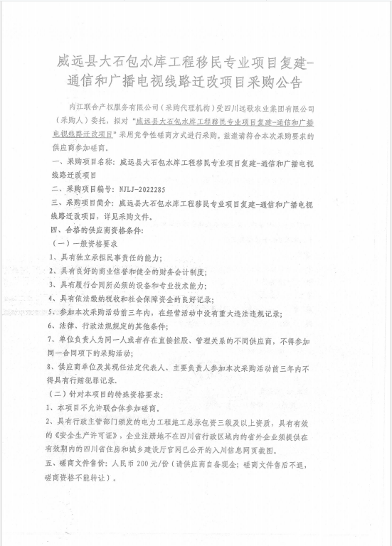 威远县大石包水库工程移民专业项目复建-通信和广播电视线路迁改项目采购公告