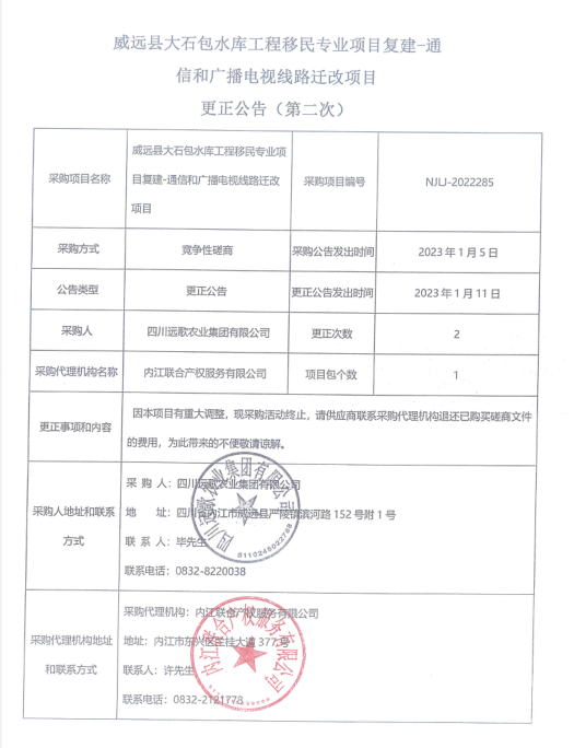 威远县大石包水库工程移民专业项目复建-通信和广播电视线路迁改项目更正公告(第二次)