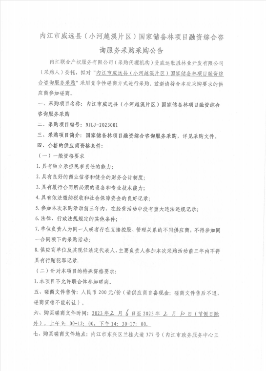 内江市威远县(小河越溪片区)国家储备林项目融资综合咨询服务采购采购公告