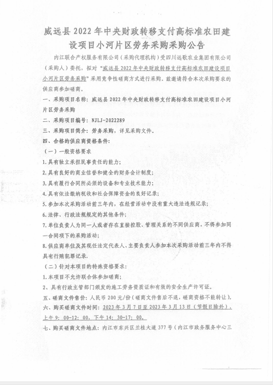 威远县2022年中央财政转移支付高标准农田建设项目小河片区劳务采购采购公告