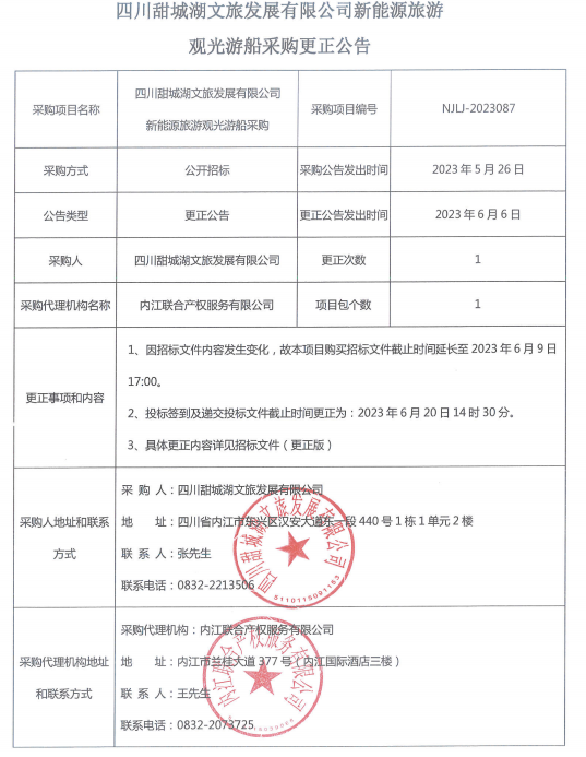 四川甜城湖文旅发展有限公司新能源旅游观光游船采购更正公告