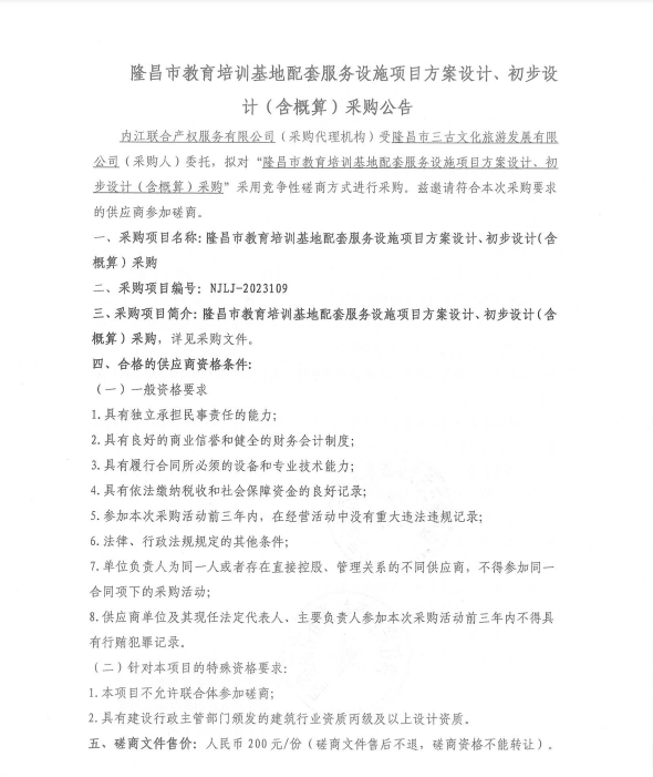 隆昌市教育培训基地配套服务设施项目方案设计、初步设计(含概算)采购公告