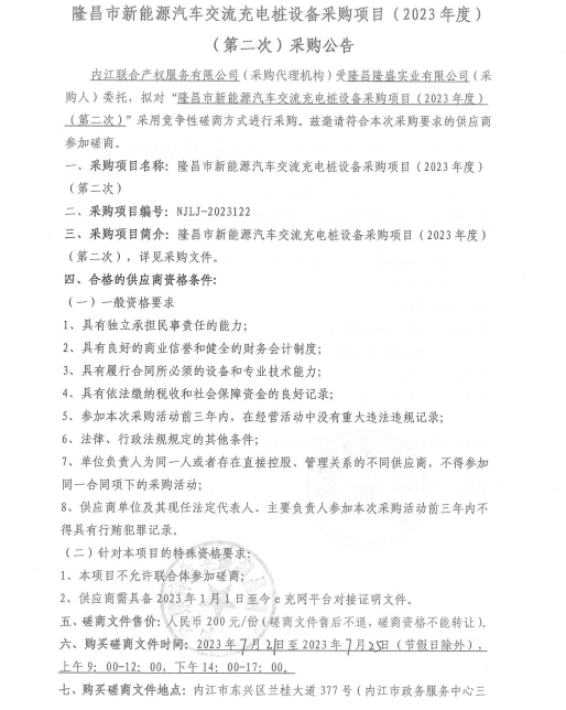 隆昌市新能源汽车交流充电桩设备采购项目(2023年度) (第二次)采购公告
