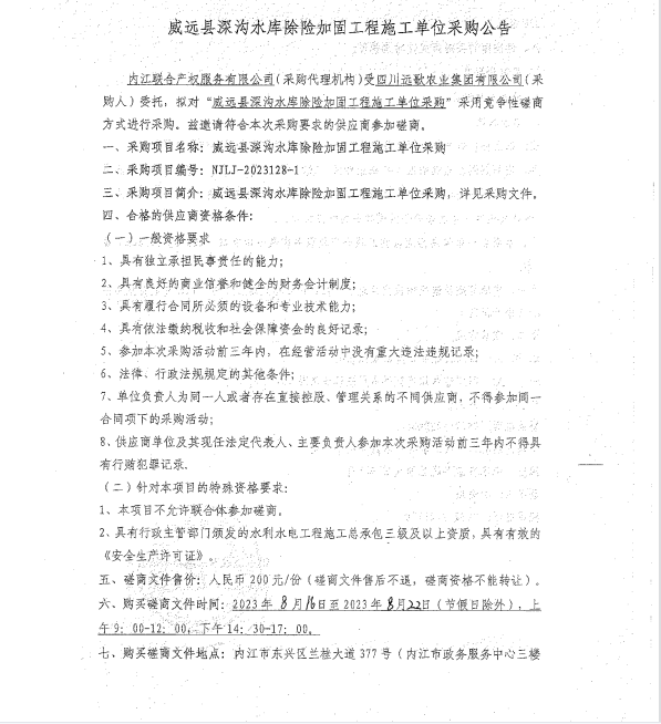 威远县深沟水库除险加固工程施工单位采购公告