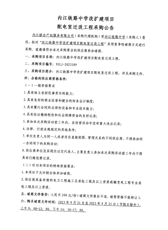 内江铁路中学改扩建项目配电室迁改工程采购公告