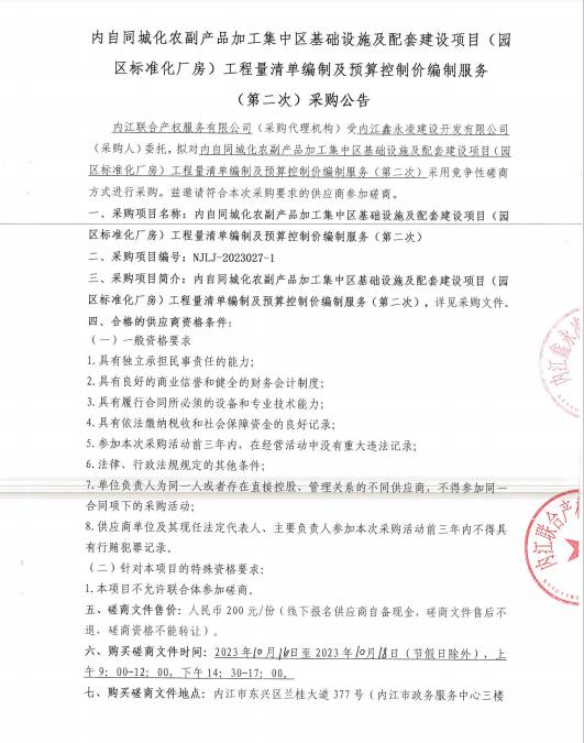 内自同城化农副产品加工集中区基础设施及配套建设项目(园区标准化厂房)工程量清单编制及预算控制价编制服务(第二次)采购公告