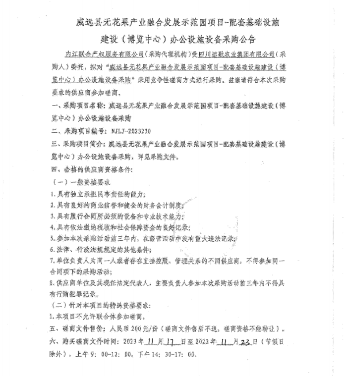 威远县无花果产业融合发展示范园项目-配套基础设施建设(博览中心)办公设施设备采购公告