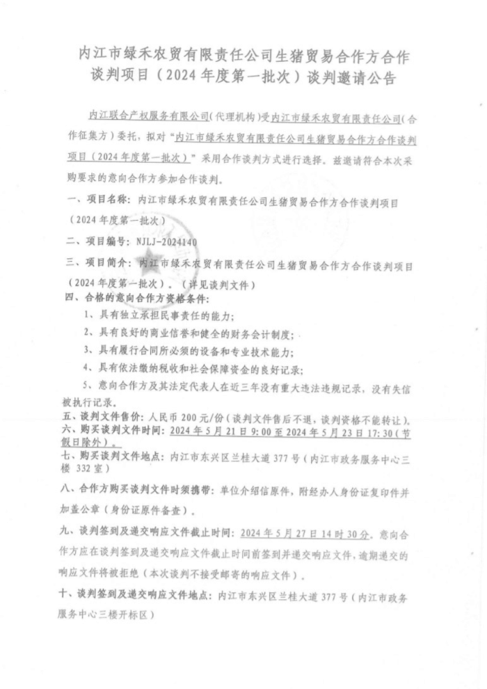 内江市绿禾农贸有限责任公司生猪贸易合作方合作谈判项目(2024年度第一批次)谈判邀请公告