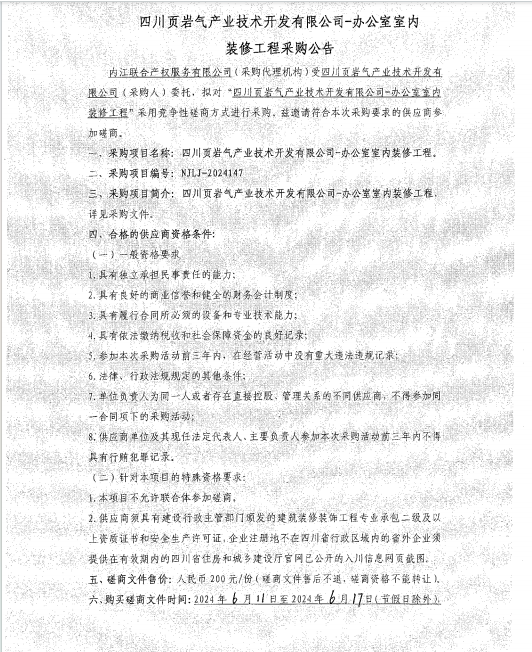 四川页岩气产业技术开发有限公司-办公室室内装修工程采购公告
