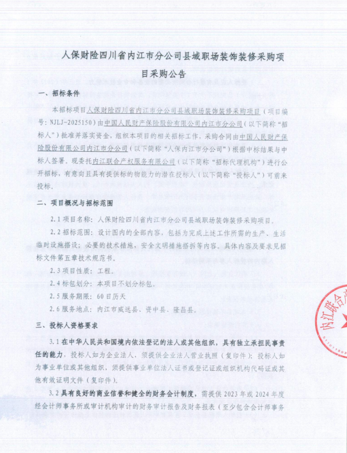 人保财险四川省内江市分公司县域职场装饰装修采购项目