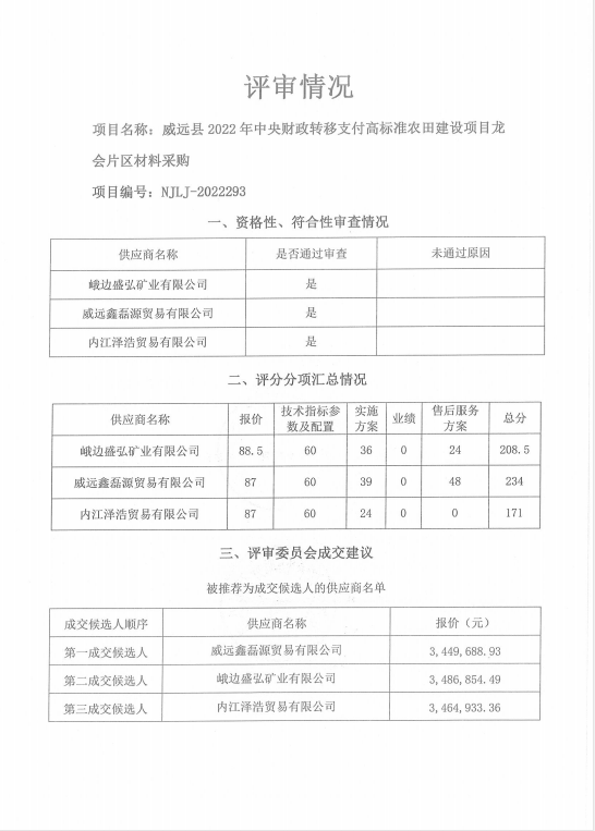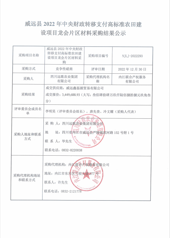 威远县2022年中央财政转移支付高标准农田建设项目龙会片区材料采购结果公示