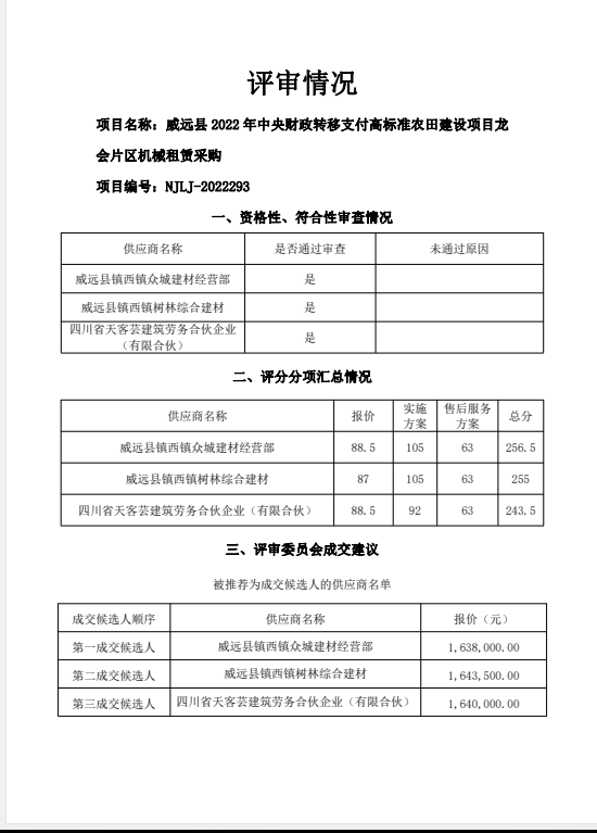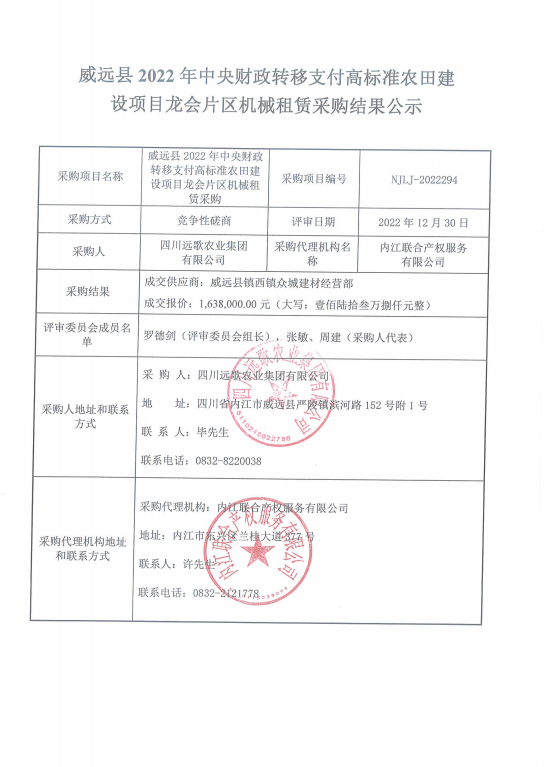 威远县2022年中央财政转移支付高标准农田建设项目龙会片区机械租赁采购结果公示