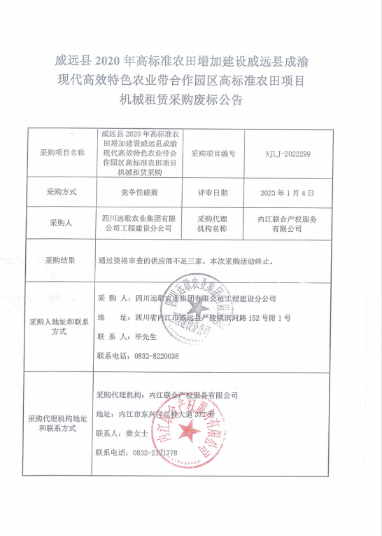威远县2020年高标准农田增加建设威远县成渝现代高效特色农业带合作园区高标准农田项目机械租赁采购废标公告