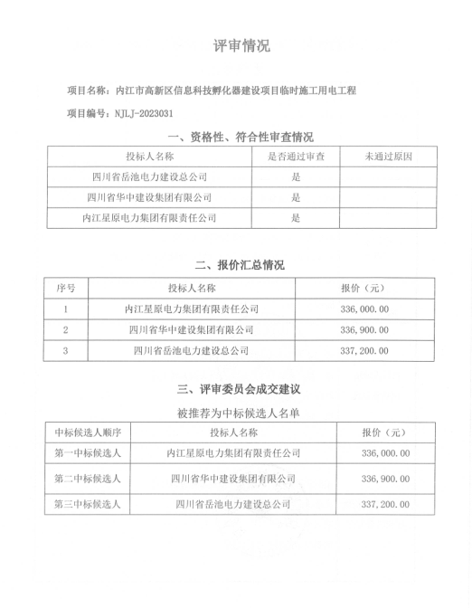 内江市高新区信息科技孵化器建设项目临时施工用电工程结果公告