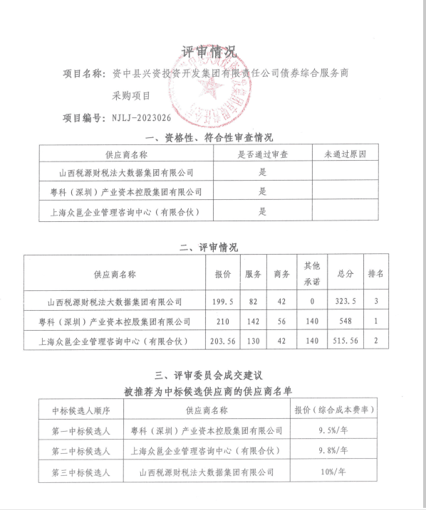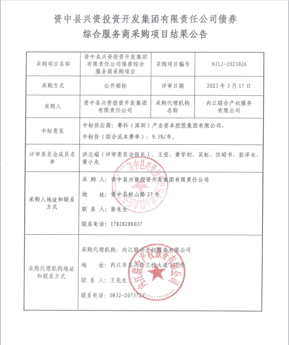 资中县兴资投资开发集团有限责任公司债券综合服务商采购项目结果公告