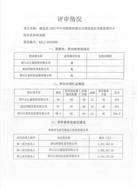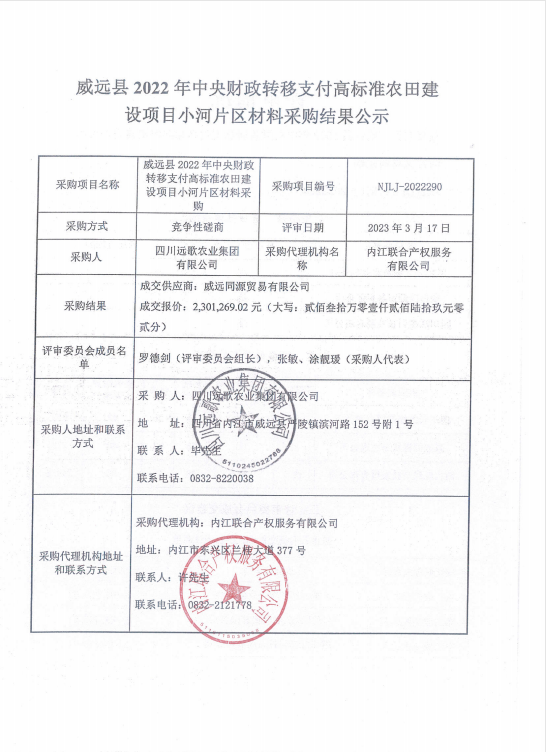 威远县2022年中央财政转移支付高标准农田建设项目小河片区材料采购结果公示