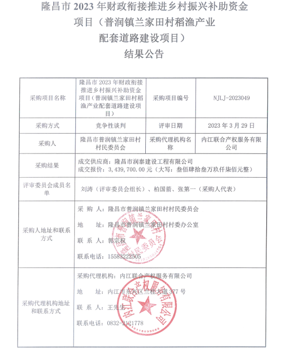 隆昌市2023年财政衔接推进乡村振兴补助资金项目(普润镇兰家田村稻渔产业配套道路建设项目)结果公告
