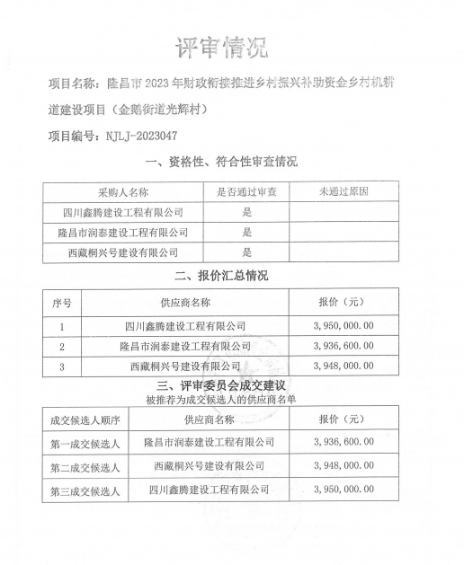 隆昌市2023年财政衔接推进乡村振兴补助资金乡村机耕道建设项目(金鹅街道光辉村)结果公告