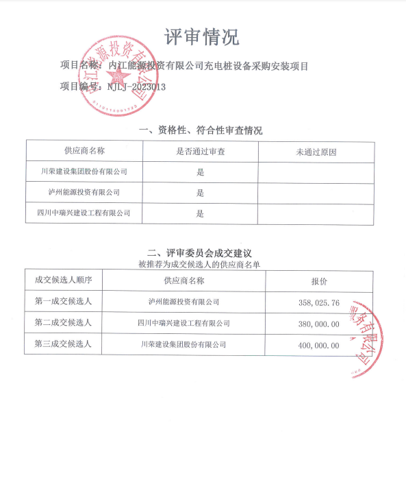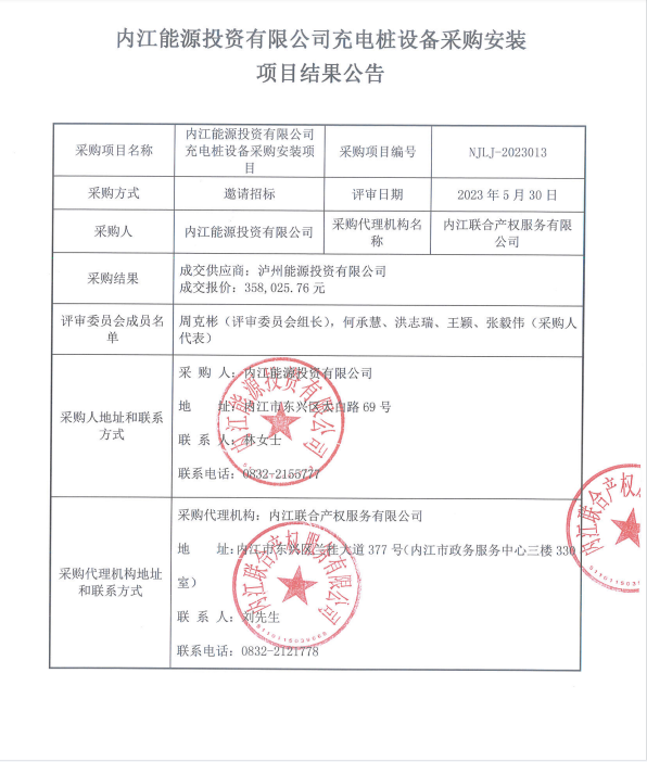 内江能源投资有限公司充电桩设备采购安装项目结果公告