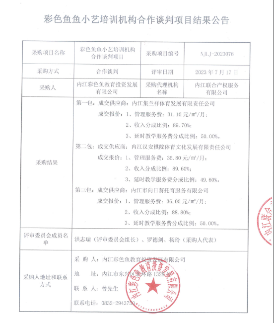 彩色鱼鱼小艺培训机构合作谈判项目结果公告