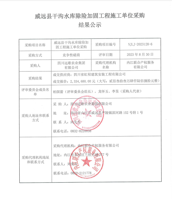 威远县干沟水库除险加固工程施工单位采购结果公示
