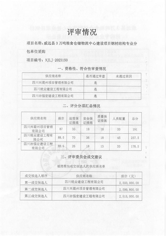 威远县3万吨粮食仓储物流中心建设项目钢材结构专业分包单位采购结果公示