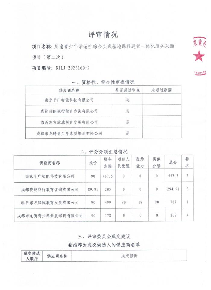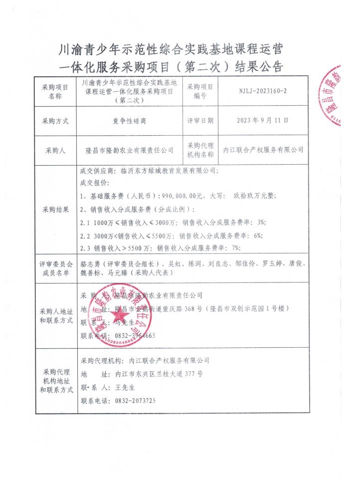 川渝青少年示范性综合实践基地课程运营一体化服务采购项目 (第二次)结果公告