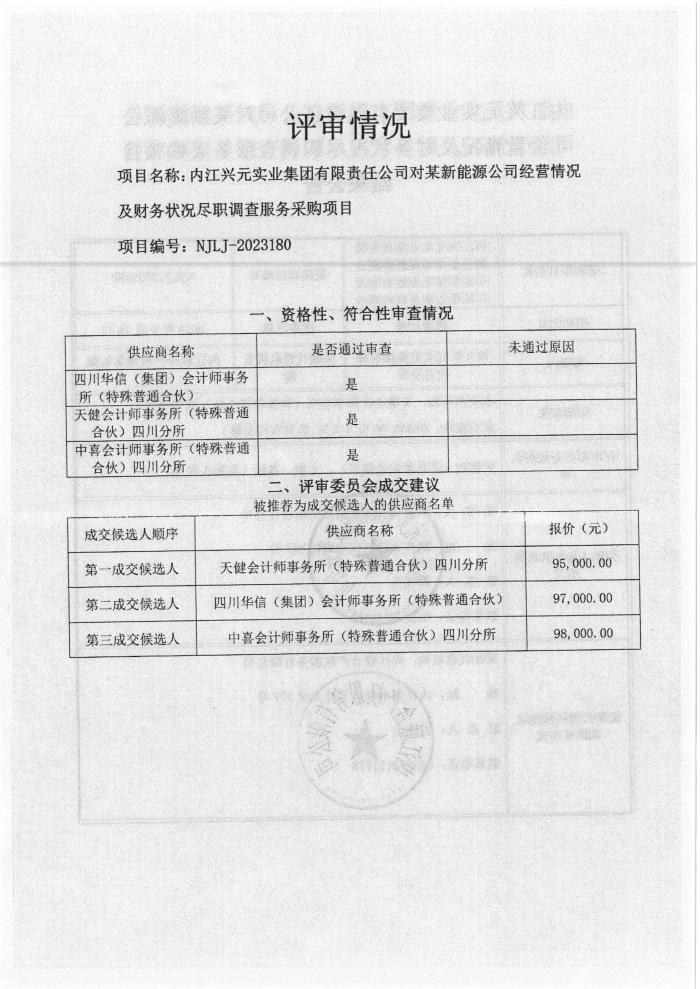 内江兴元实业集团有限责任公司对某新能源公司经营情况及财务状况尽职调查服务采购项目结果公告