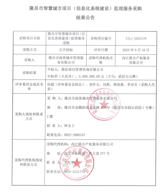 隆昌市智慧城市项目(信息化系统建设)监理服务采购结果公告