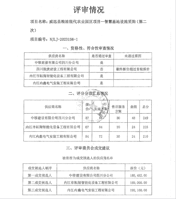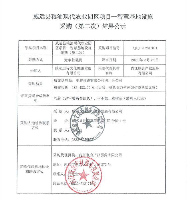威远县粮油现代农业园区项目—智慧基地设施采购(第二次)结果公示
