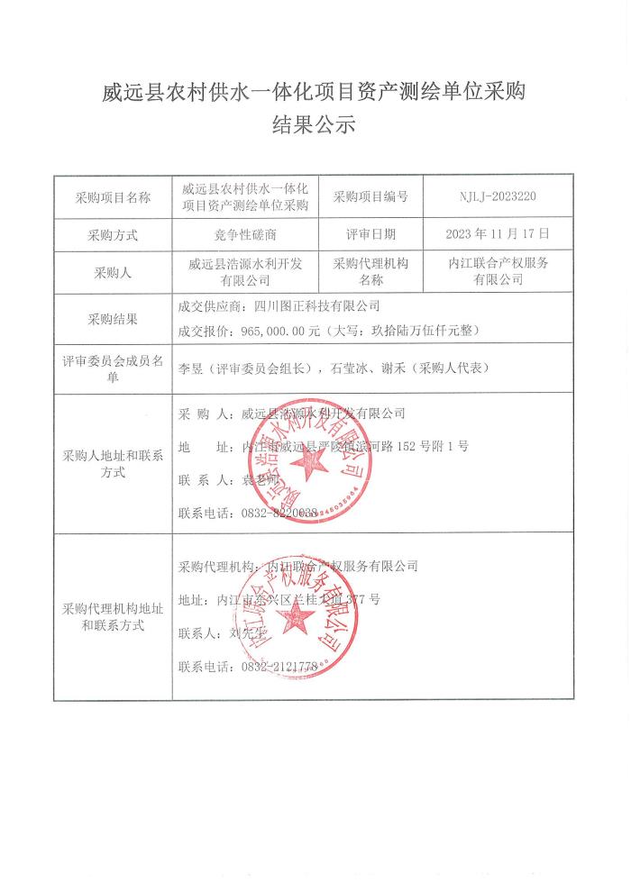 威远县农村供水一体化项目资产测绘单位采购结果公示