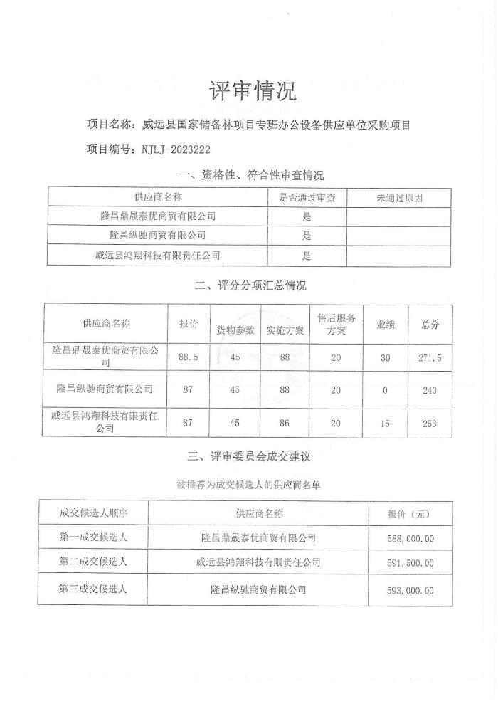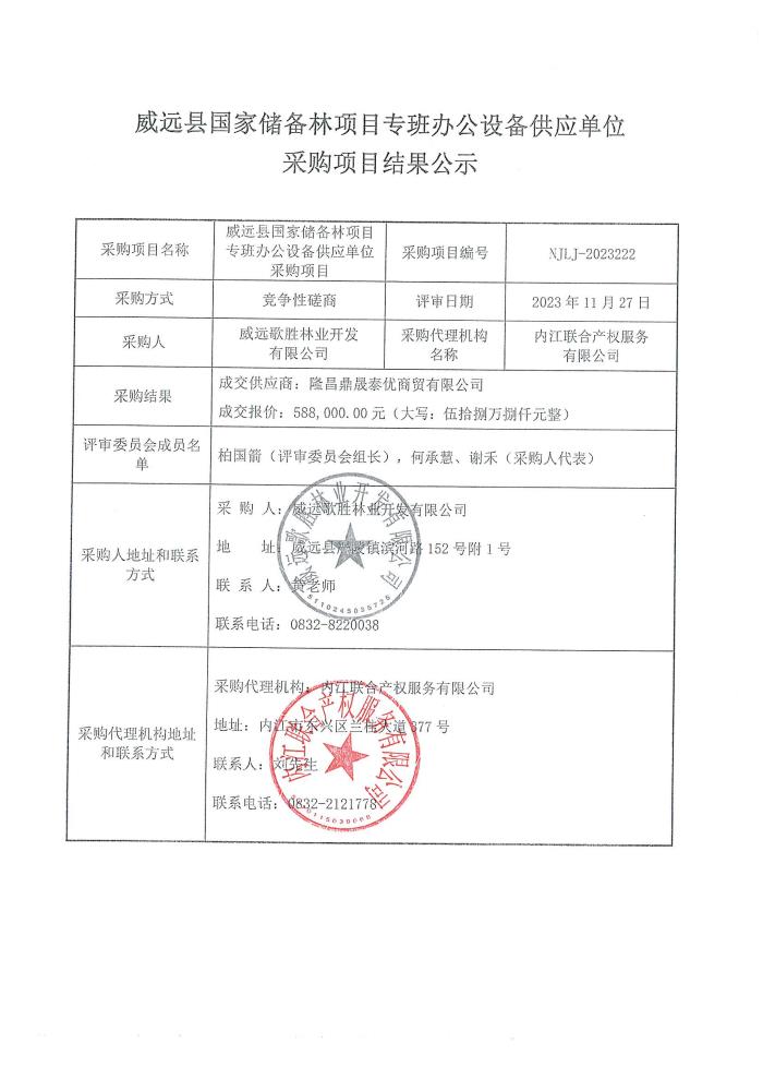 威远县国家储备林项目专班办公设备供应单位采购项目结果公示