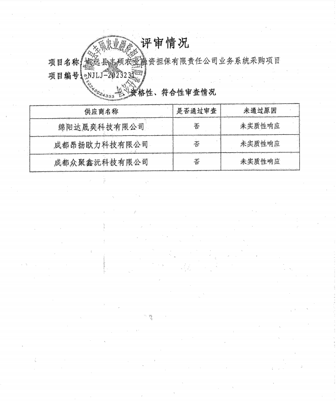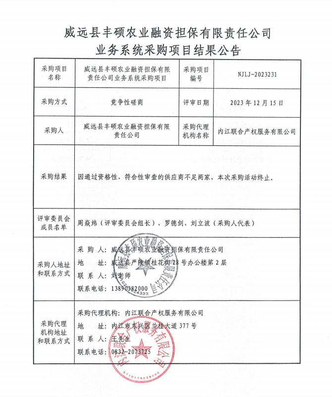 威远县丰硕农业融资担保有限责任公司业务系统采购项目结果公告