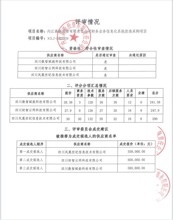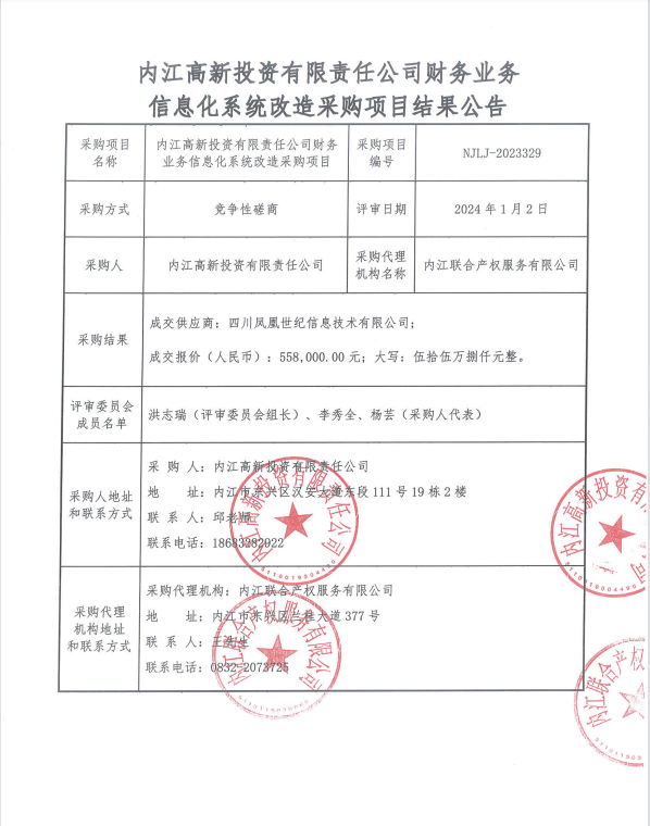 内江高新投资有限责任公司财务业务信息化系统改造采购项目结果公告