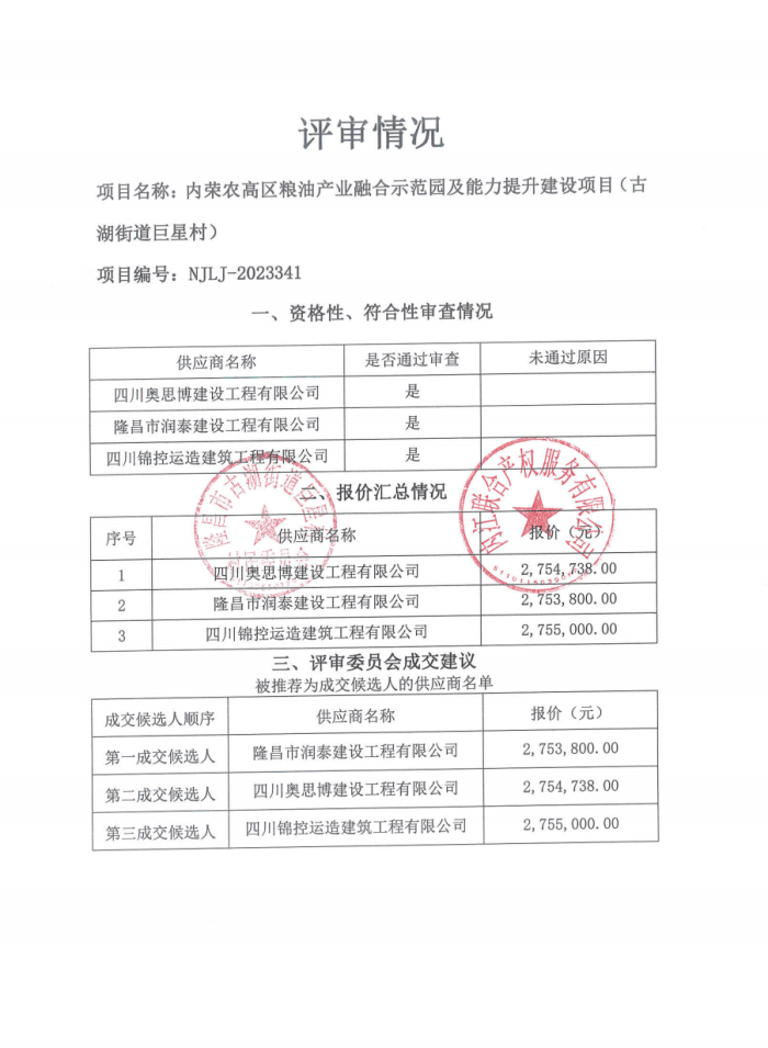 内荣农高区粮油产业融合示范园及能力提升建设项目(古湖街道巨星村)结果公告