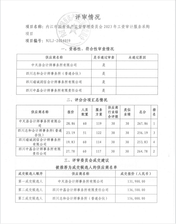 内江市国有资产监督管理委员会2023年工资审计服务采购项目结果公告