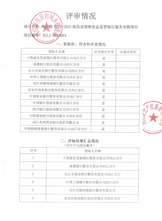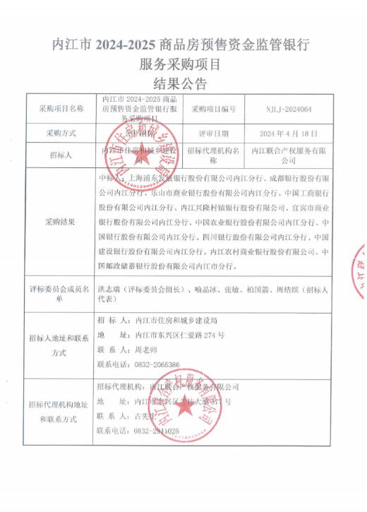 内江市2024-2025商品房预售资金监管银行服务采购项目结果公告