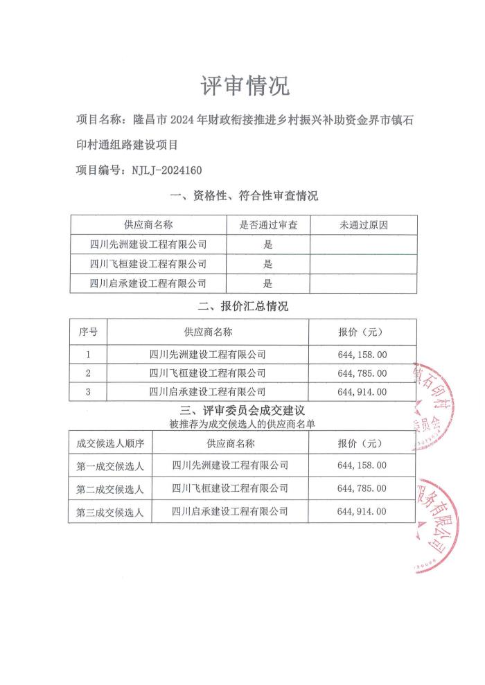 隆昌市2024年财政衔接推进乡村振兴补助资金界市镇石印村通组路建设项目结果公告