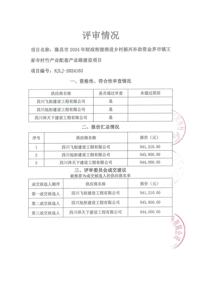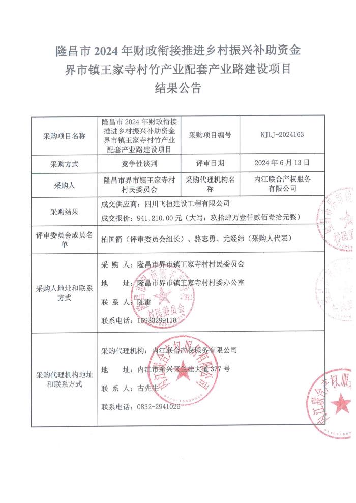 隆昌市2024年财政衔接推进乡村振兴补助资金界市镇王家寺村竹产业配套产业路建设项目结果公告